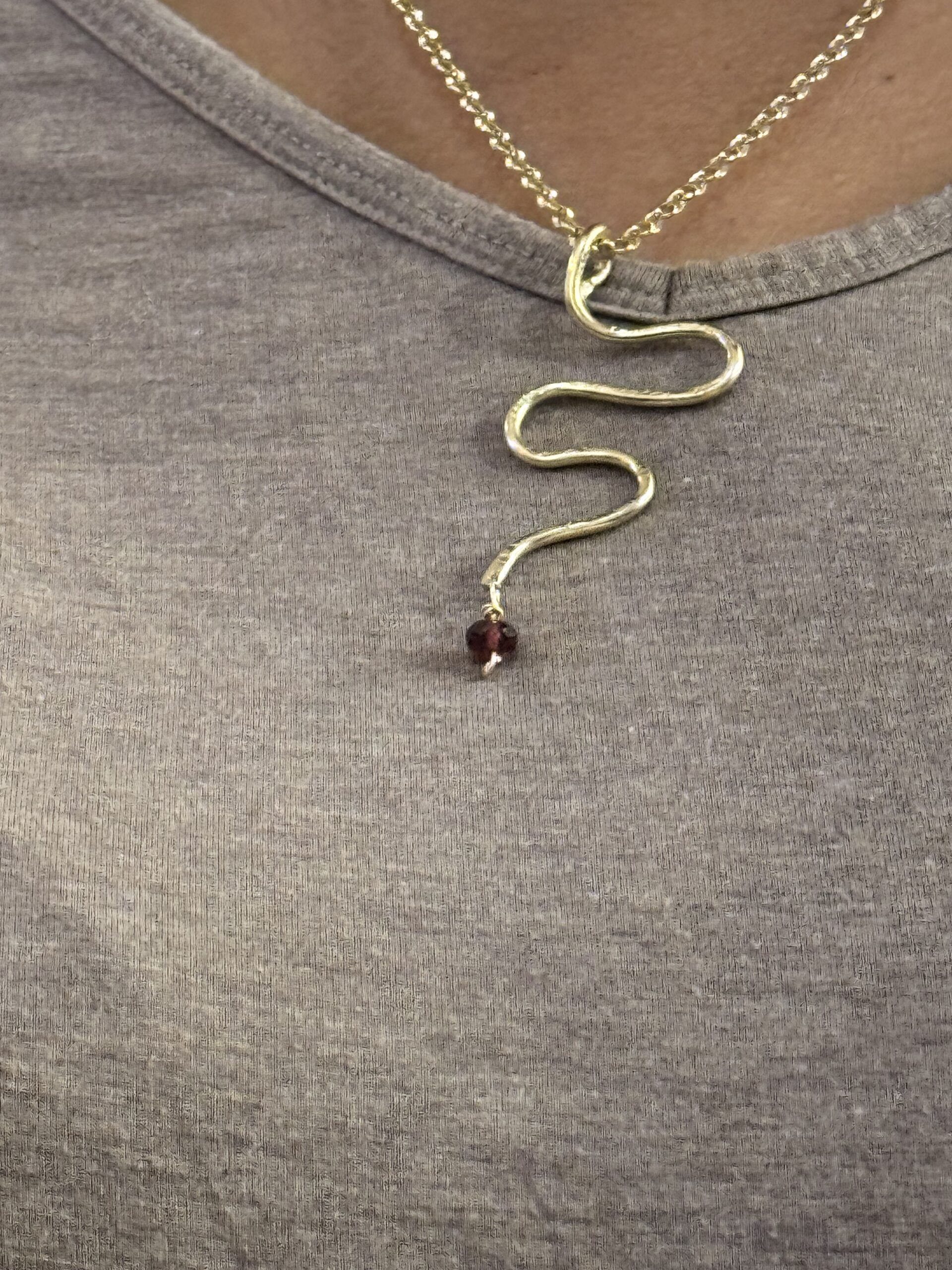 This is the Chinese “ year of the snake”. Snakes represent transformation. Become the new you as you enjoy this beautiful handmade gold- filled snake pendant . Pendant measures approx 2-inch’s by 1.5- inches and is suspended from a 20- inch gold filled chain and lobster clasp