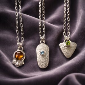 Handcrafted oval textured sterling silver pendant is accented with fused 23k gold designs. It is suspended from a sterling silver bail and 18-inch snake chain